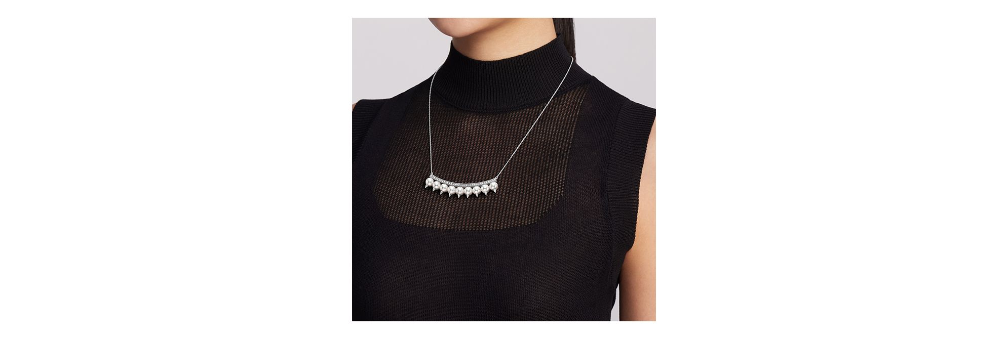 “danger plus diamonds pave”系列在柔和的弧形线条与圆润珍珠之上饰有轮廓精美的利齿,强烈对比之下凸显珠宝的前卫气息。这款密镶钻石项链饰有温润阿古屋珍珠和18K白金,绽放迷人光采,彰显优雅风格。