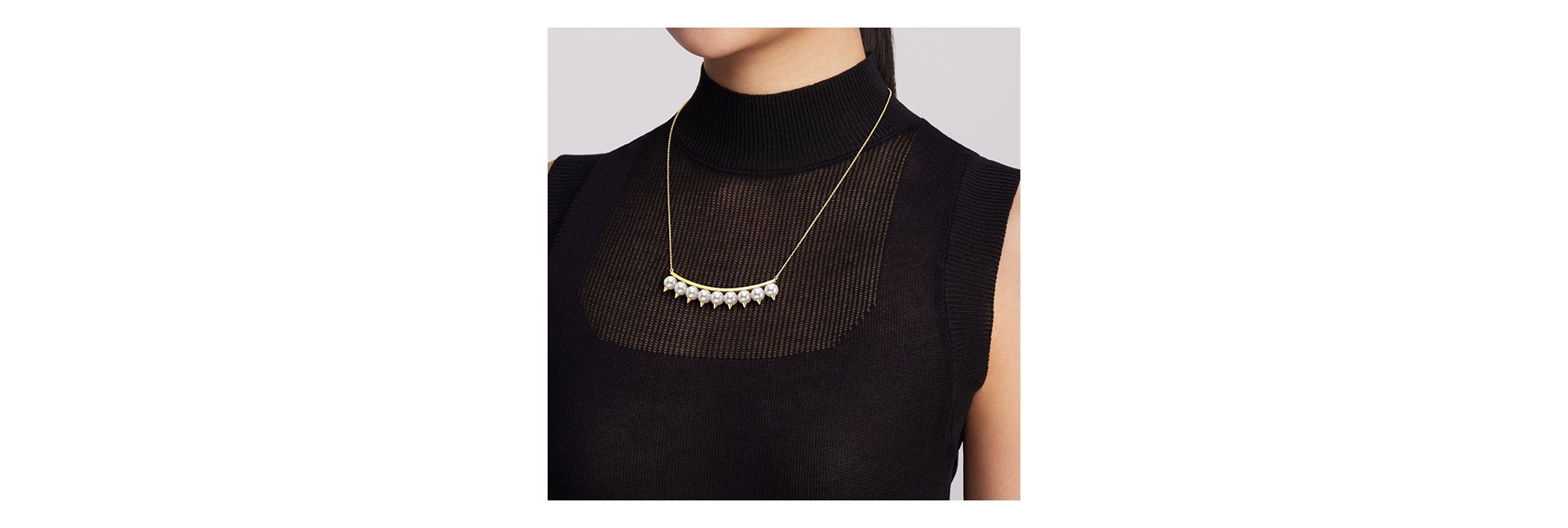 “danger plus”系列金属线条与圆润珍珠勾勒柔和弧线,与轮廓精美、极具前卫气息的利齿造型形成强烈对比。这款项链饰有光泽动人的阿古屋珍珠以及18K黄金利齿,为颈间增添一抹时尚优雅的气息。