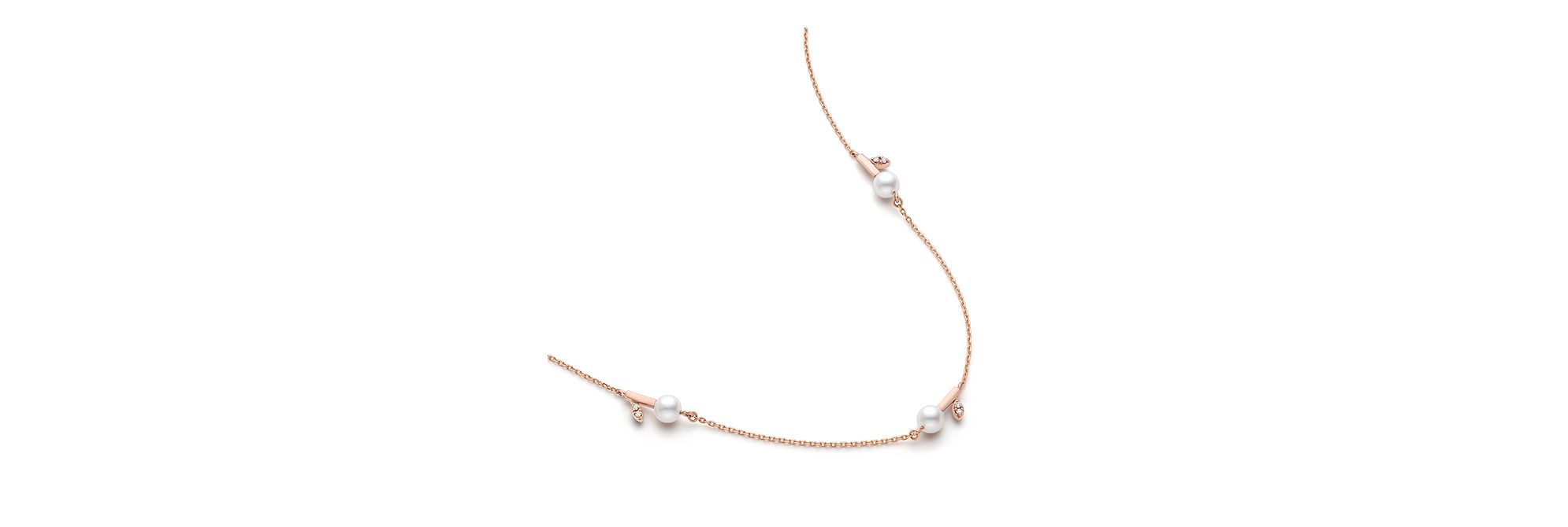 《创世纪》中苹果及其果叶承载着“智慧果实”美好寓意,之后也逐渐变为圣诞节必不可少的装饰,“kugel”系列以此为灵感创作优雅珠宝。此款珍珠项链采用镶钻叶片设计,珍珠的莹亮光泽与樱花金的柔美色调交相辉映。
