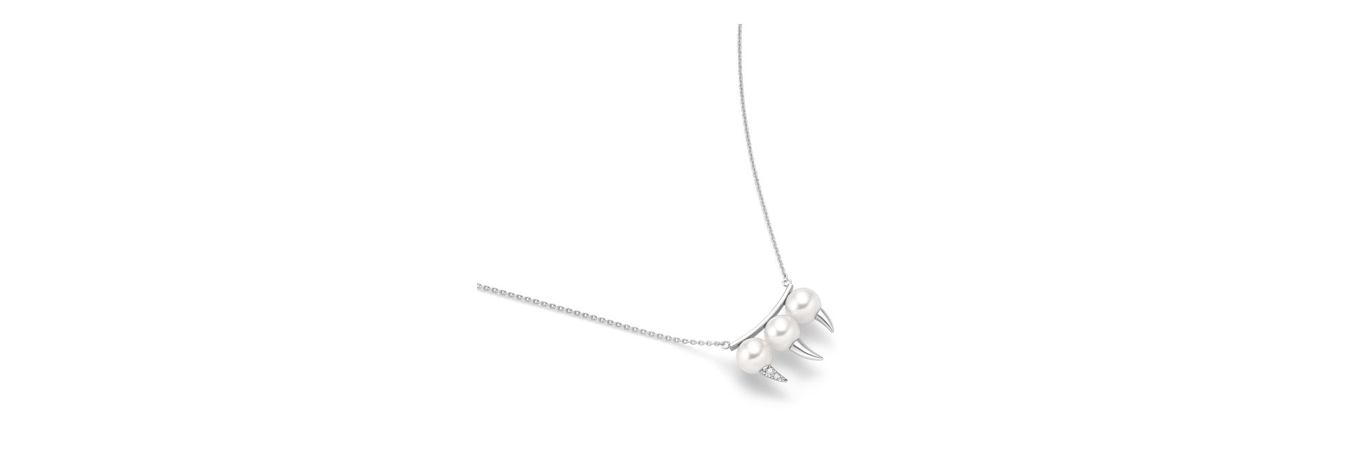18K白金利齿和圆润的阿古屋珍珠交织出反差美感。这条“danger fang”项链以危险迷人的设计,散发出摄人心魄的时尚魅力,适合搭配日常造型。密镶钻石的灵动光芒映衬出华美别致的韵律。