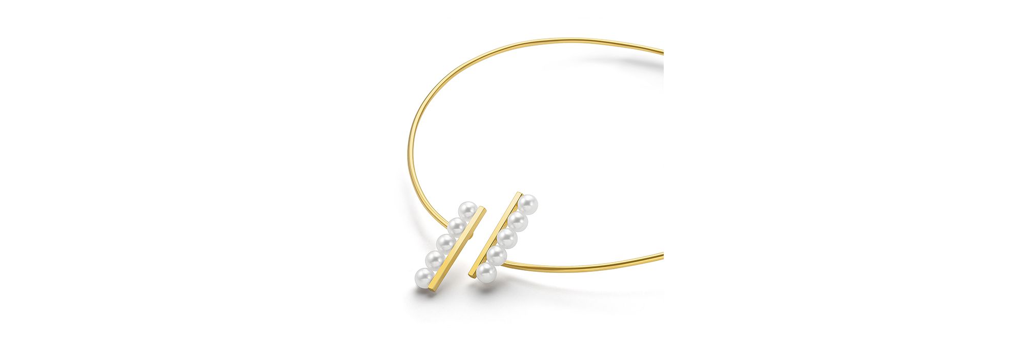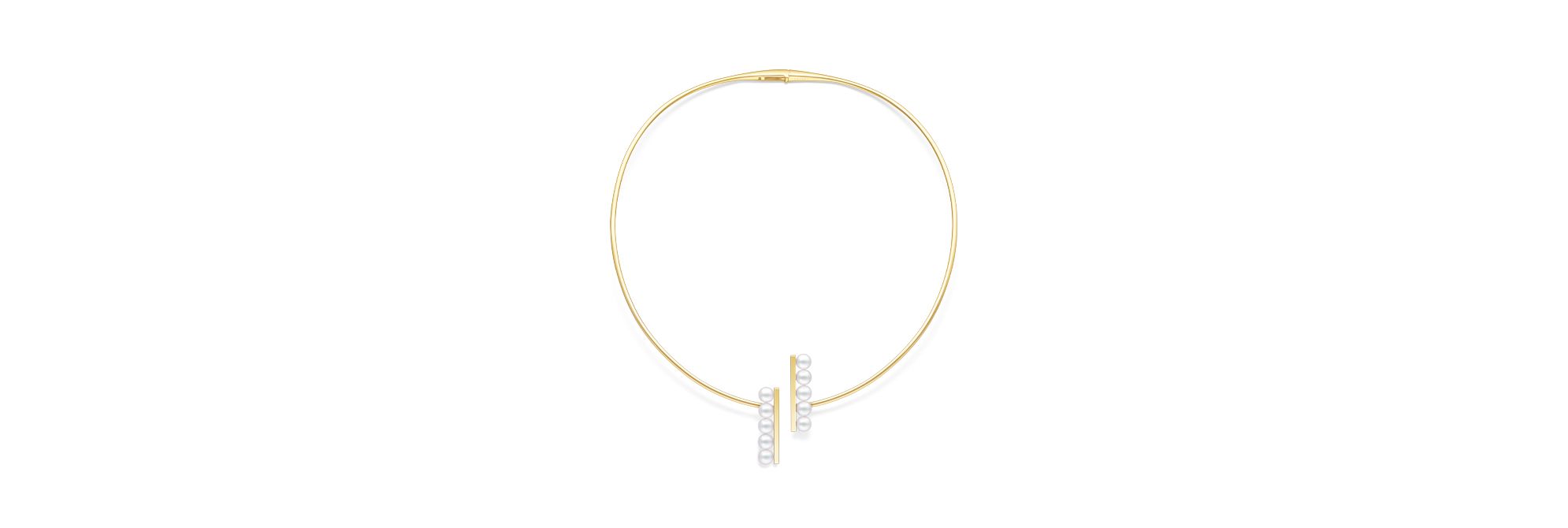 该项链采用“balance”系列标志性5 颗阿古屋珍珠排列设计,珍珠列于两个平行非对称的18K黄金直杆之上,错落呼应间传达平衡和谐之美。整体造型延续了balance系列的轻盈悬浮美感,于颈间呈现优雅精致魅力。