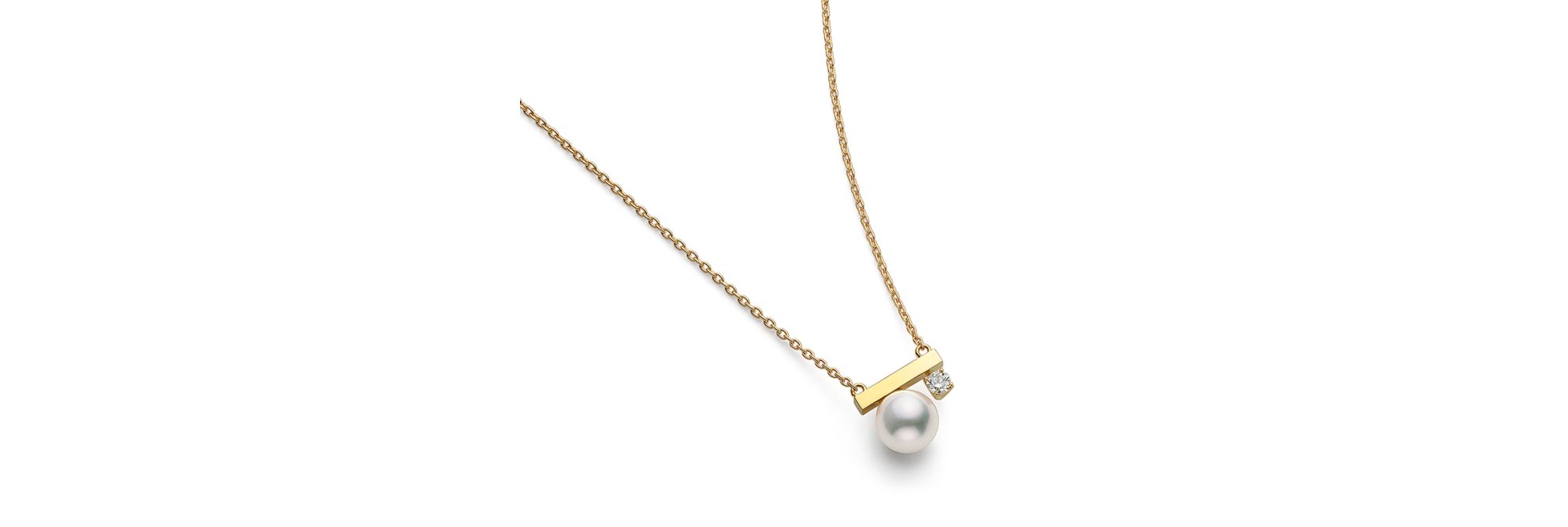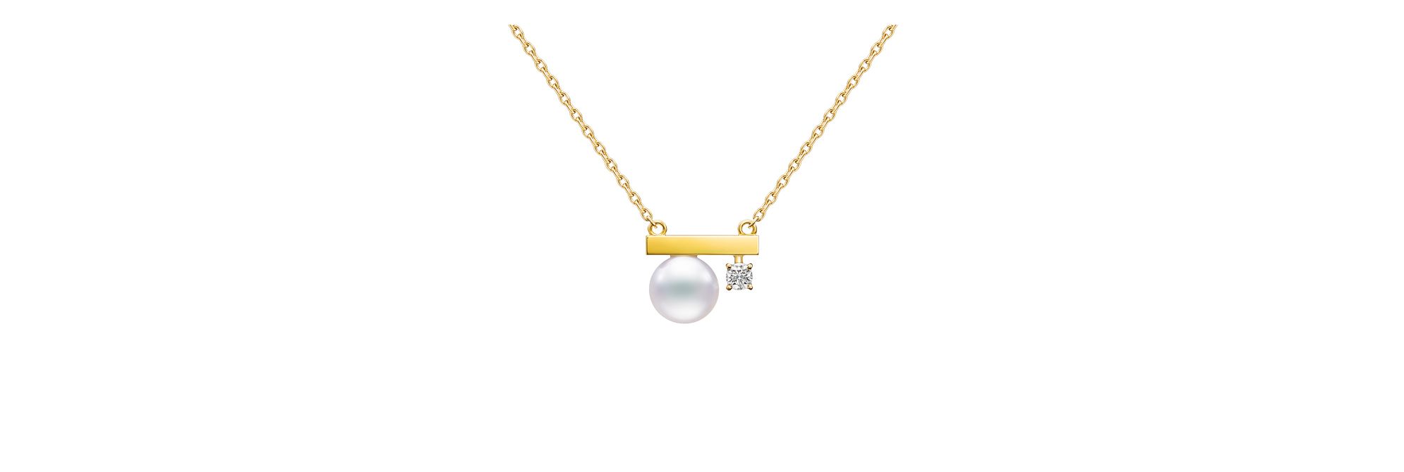 这款优雅的项链以单颗阿古屋珍珠和单颗钻石点缀于黄金直杆上,外形纤巧,风格可爱,洋溢着优雅气息与动人光芒。