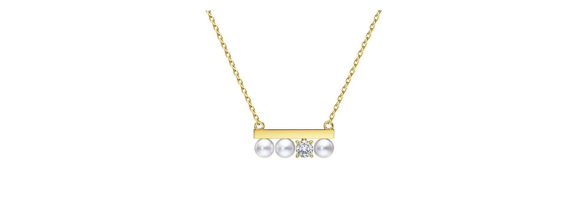这是TASAKI “balance diamonds solo”项链的迷你版,以在排列于直杆上的珍珠中插入单颗钻石为特色。精巧尺寸可与任何造型配搭,非常适合日常配戴。