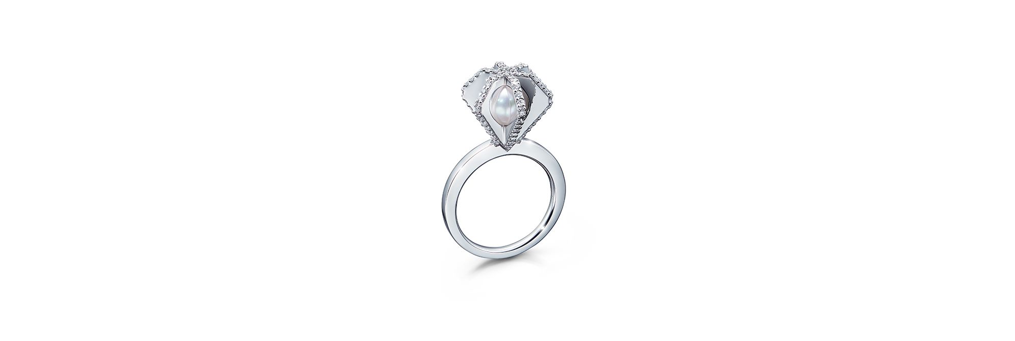 18K白金薄片勾勒华光四溢的钻石轮廓,悉心呵护一颗内嵌珍珠,呈现别出心裁的迷人设计。每片白金薄片均镶嵌钻石,更添奢华质感。这款戒指采用立体结构,流露出灵动气息,令人心醉神迷。