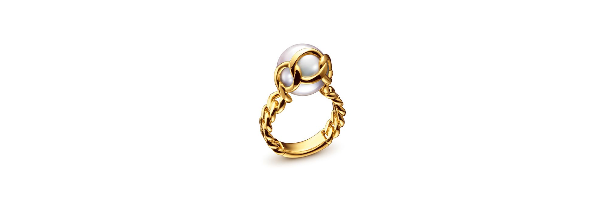 TASAKI “STRETCHED”系列珠宝以金链巧妙环饰珍珠。18K黄金以多变的形状和厚度,营造活泼与动感。优雅端庄与性感妩媚两种截然不同的气质,在此时尚设计中并存不悖。这款戒指以豪放的金链环饰珍珠,彰显独特气质。