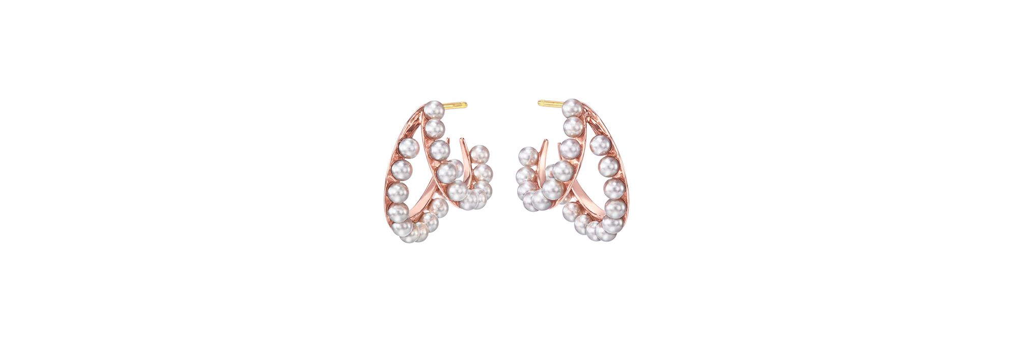 “Surge”系列珠宝以精致大胆的造型,勾勒海浪涌动的景象。这款双圈耳环以樱花金打造,创意设计尽显海浪的动感活力,搭配数不胜数的小珍珠,生动演绎浪花飞溅的景象。
