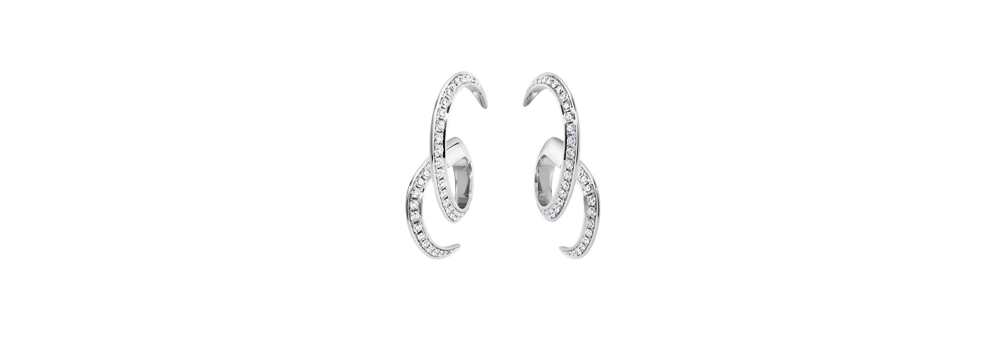 “Surge”系列珠宝象征潮汐的涌动。这款耳环的两个白金半圆环宛若悬浮于耳畔,密镶钻石散发璀璨光芒,令此创意设计更添绚丽风采。