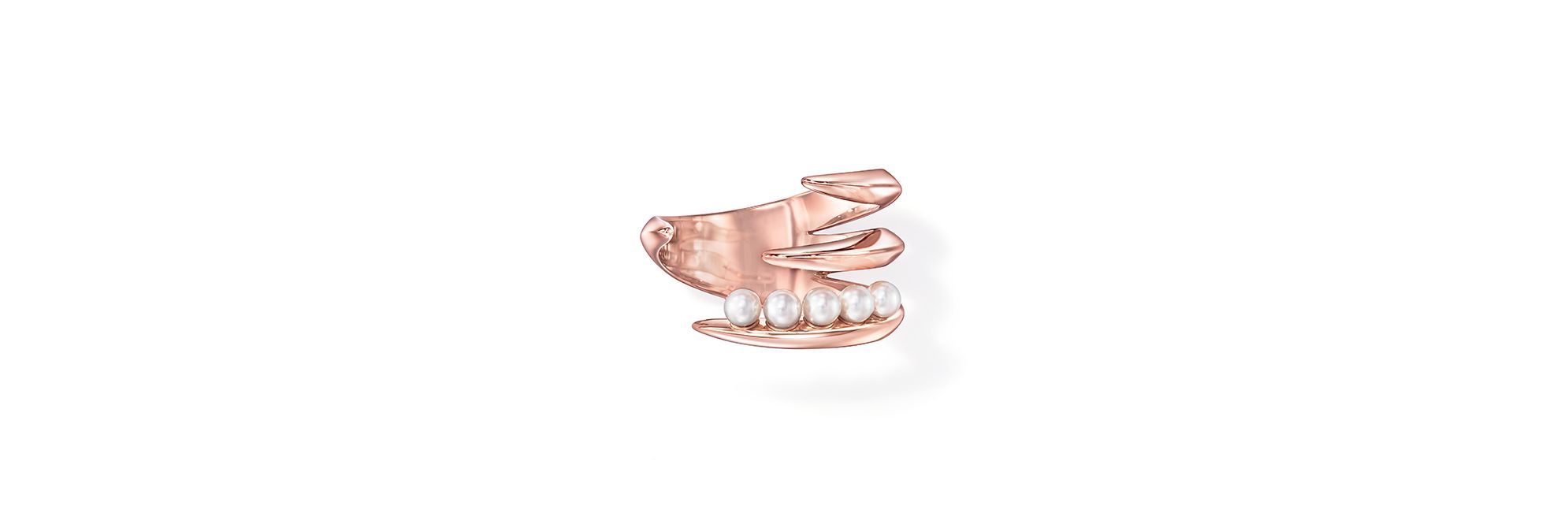 “Surge”系列珠宝以精致大胆的造型,勾勒海浪涌动的景象。这款戒指造型独特,以樱花金勾勒曼妙曲线,点缀一排莹润闪耀的小珍珠。匠心设计确保戒指佩戴顺畅舒适。