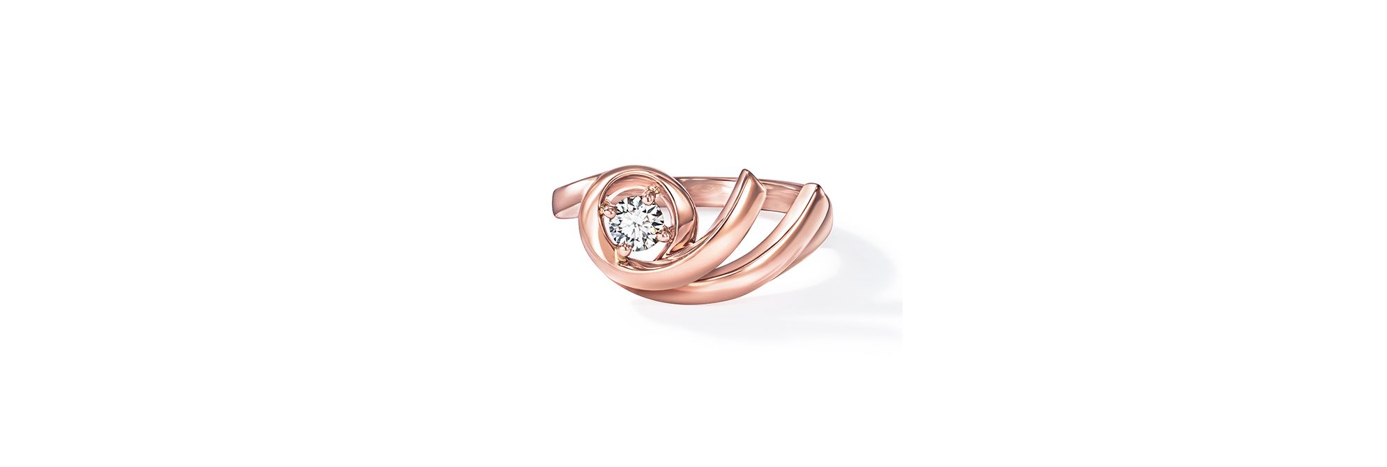“Swirl”系列呈现不断翻滚的海潮和自由游弋的鱼群,令变幻不休的海洋之景跃然眼前。此款戒指镶饰一颗精致夺目的璀璨钻石,点缀于旋涡中央,引人瞩目。樱花金曲线饰以密镶钻石,从不同角度折射迷人光线。