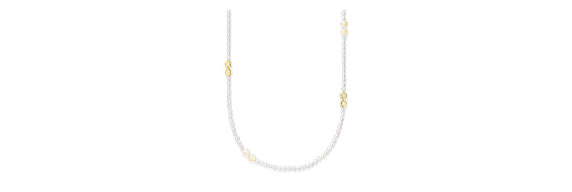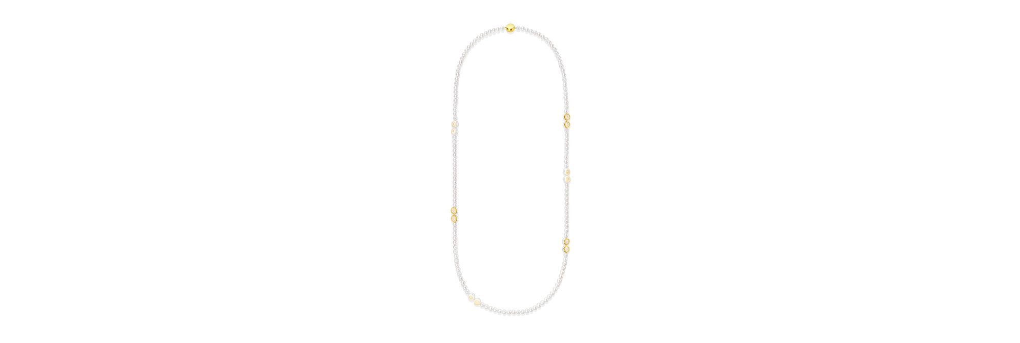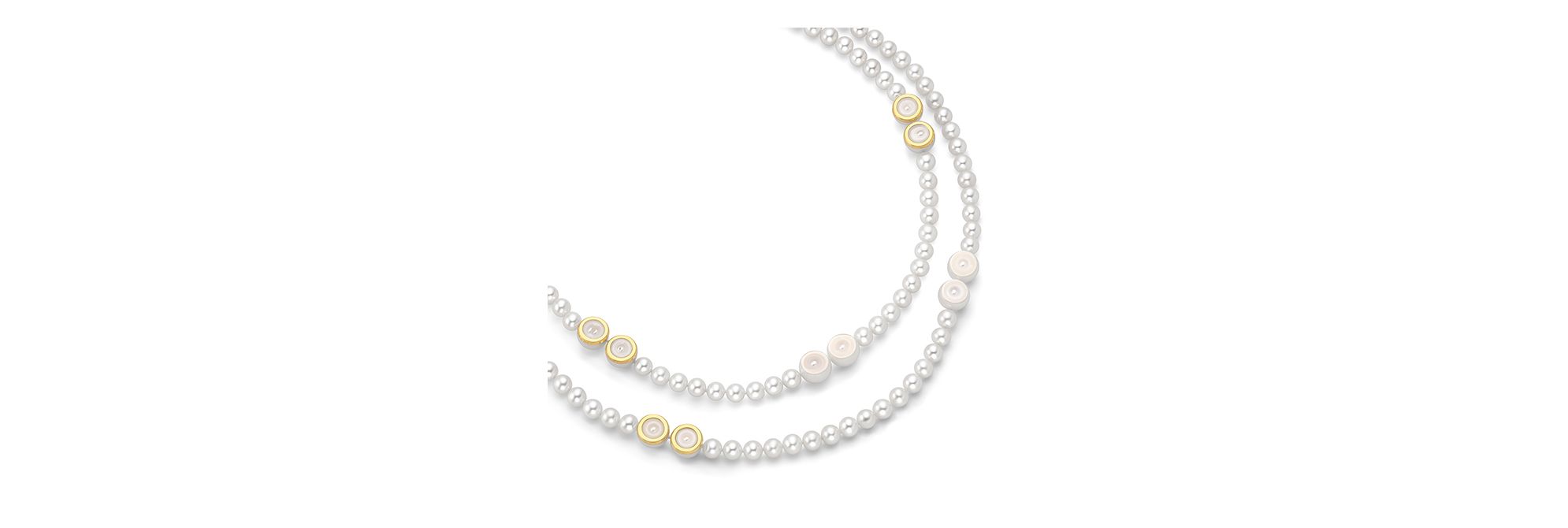 “SLICED BEZEL”项链敬呈别致设计,将剖面珍珠以不同角度排布穿插在18K黄金球体之间。剖面珍珠表面镶嵌18K黄金圆框,巧妙彰显珍珠内部生长层的迷人魅力。这款项链将创新设计与TASAKI卓越工艺相结合,敬呈独特而迷人的珍珠珠宝。