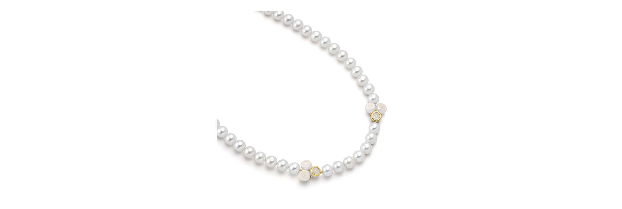 “SLICED BEZEL”珍珠项链采用立体排布的剖面珍珠进行点缀。18K黄金圆框细节巧妙烘托珍珠内部生长层的神秘美感。项链采用剖面珍珠造型搭扣,无论从哪个角度都呈现出浑然天成的美感。