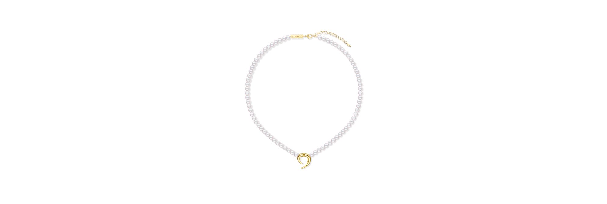 “danger horn plus”系列生动华丽的尖角造型采用夺目的18K黄金色调。一对向内对弯的尖角为“danger horn”系列开辟全新审美维度。这条项链采用大小适中的阿古屋珍珠打造,轻松搭配日常造型。