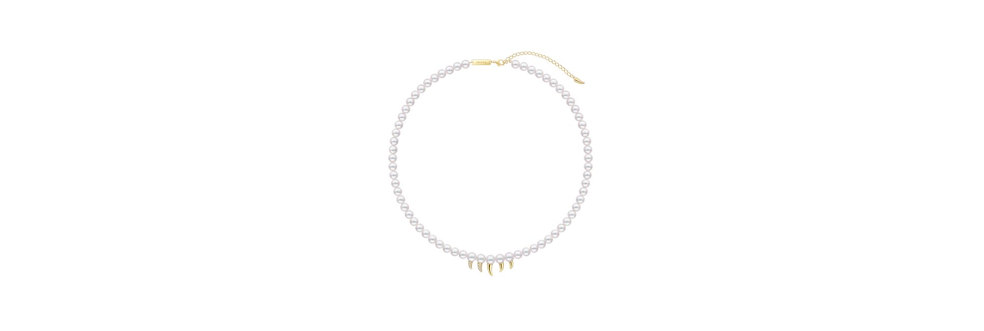 18K黄金利齿和圆润的阿古屋珍珠交织出反差美感。这款“danger fang”项链通过精心打磨的利齿和璀璨的密镶钻石,散发出前卫大胆的型格魅力。