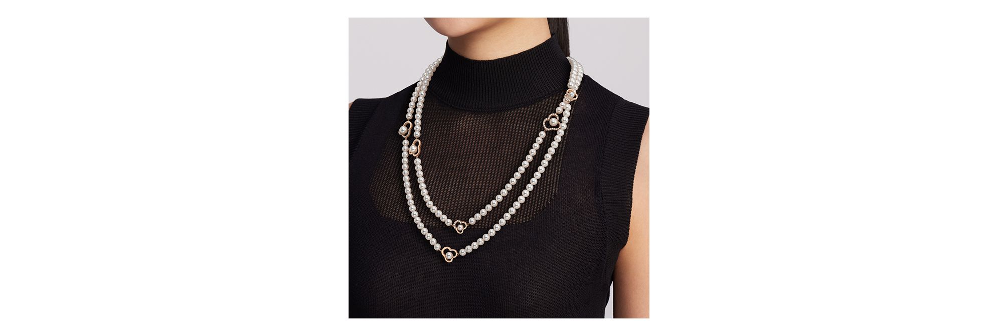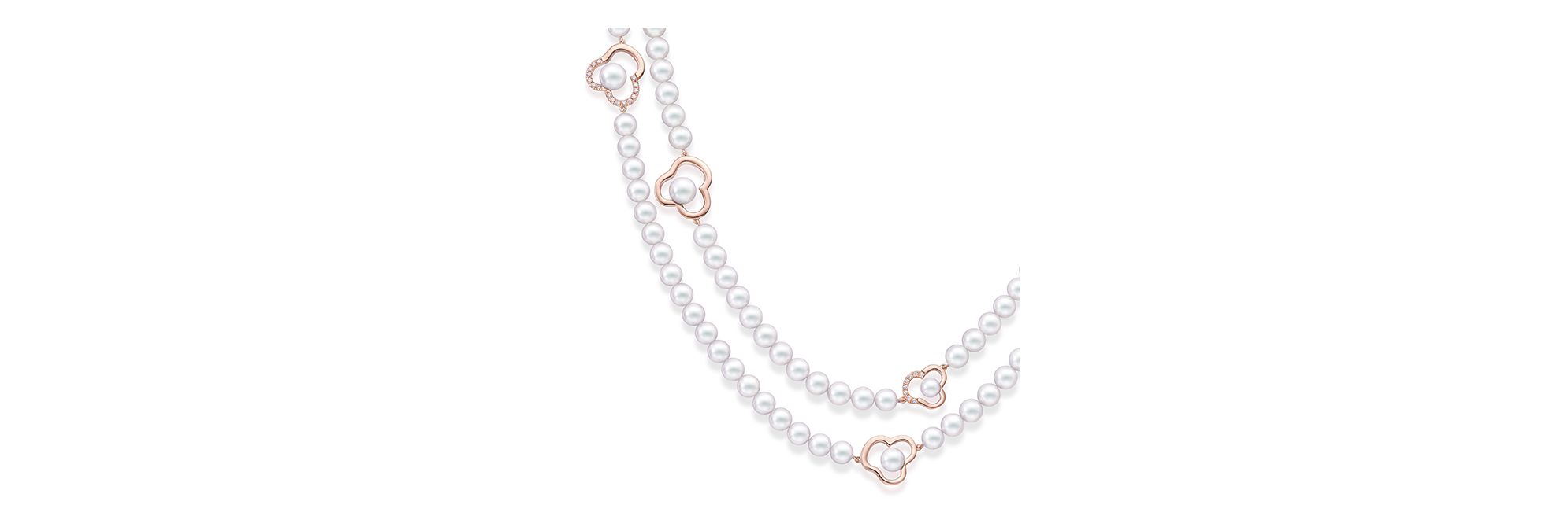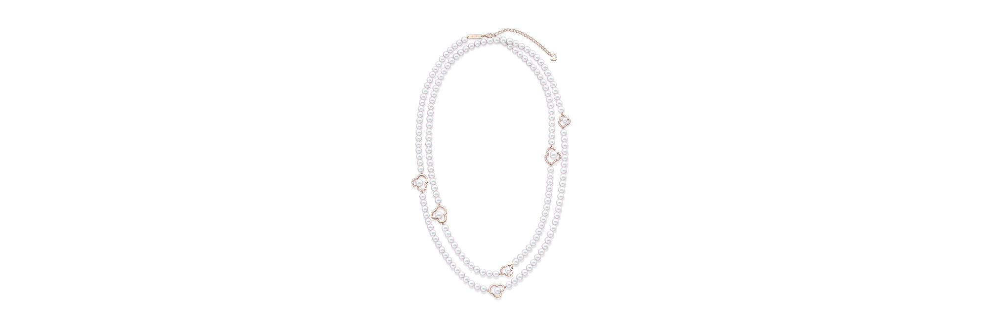 “chants signature”项链凝聚花卉美学精髓,融合时尚优雅与精致细节,绽放迷人的艺术气息。莹润的珍珠点缀于饰有密镶钻石元素的樱花金花朵轮廓之间,散发出柔和温润的华彩。这款项链可双层或三层佩戴,轻松适应多样造型,优雅点亮每一套穿搭。