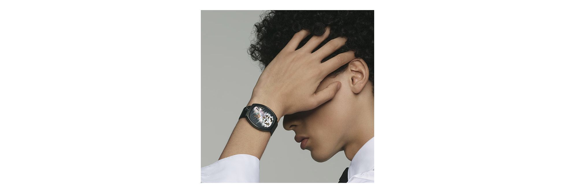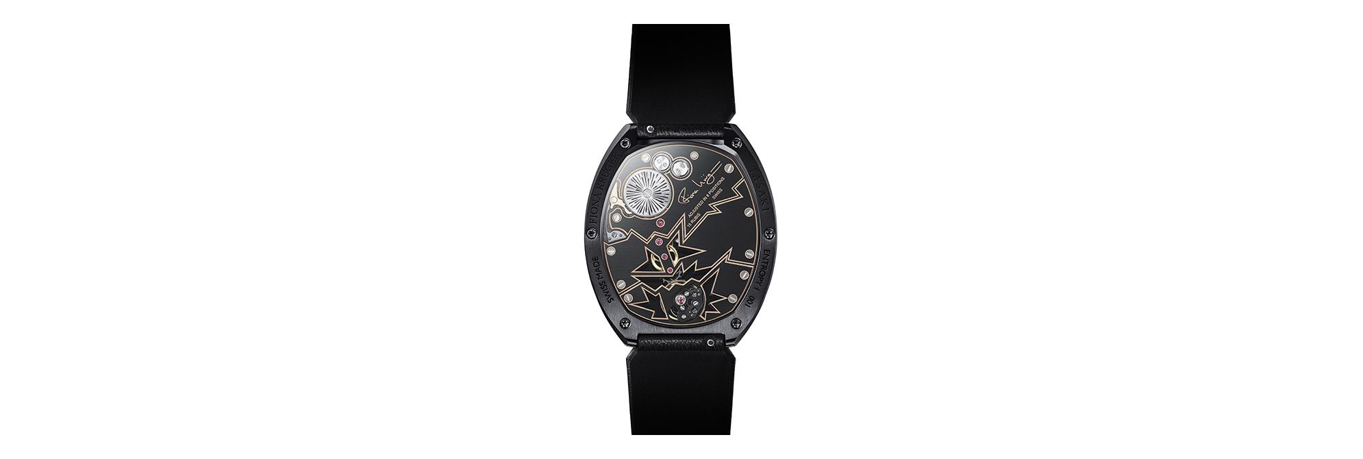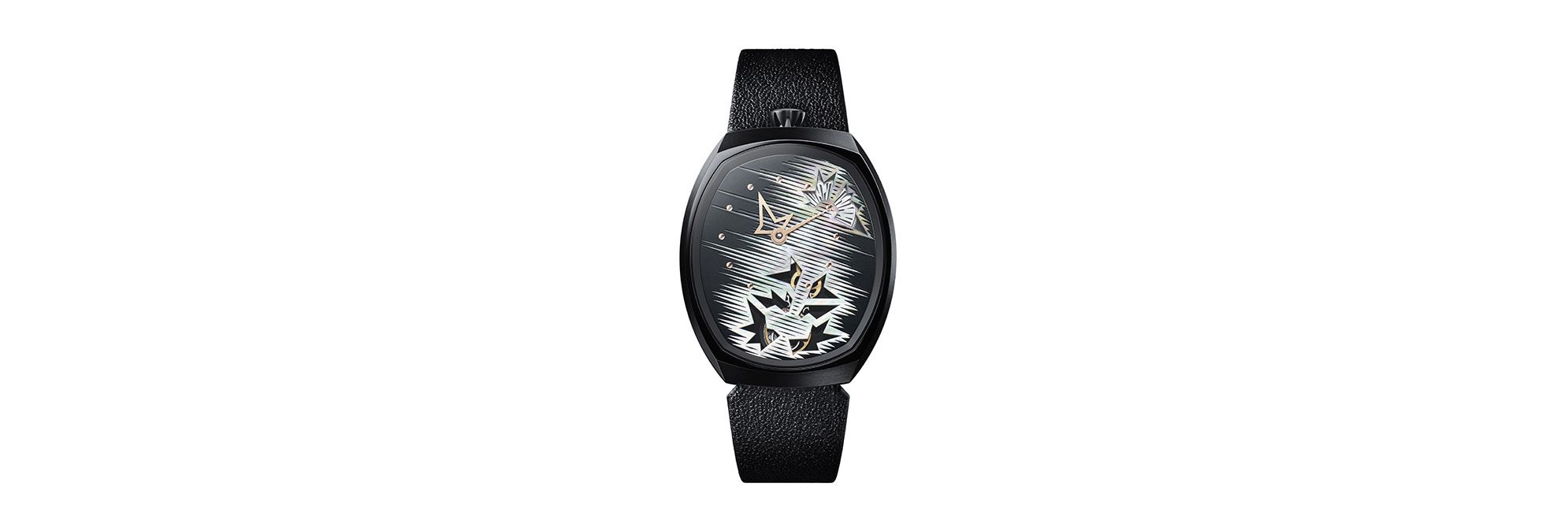 这款腕表为Fiona Krüger标志性“CHAOS”系列合作款,配备TASAKI风格珍珠母贝表盘,尽显华美格调。表盘上点缀精美的手绘黑色线条,象征混沌世界的图案跃然眼前。透过镂空图案可一窥其后的精妙机械装置。