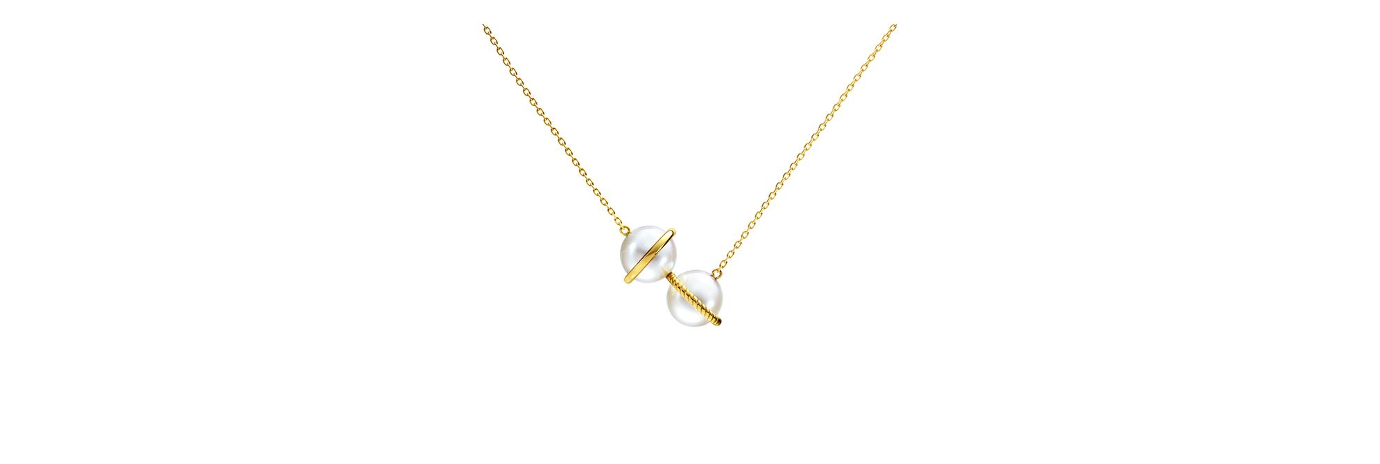 这款项链以细腻的18K黄金丝线,轻柔交织于一对珍珠,尽显时尚与复古。